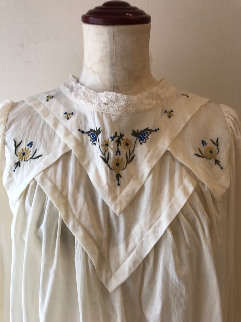 ☆コットンローン ☆レトロな刺繍入りのハンカチを重ねたメージをヨーク仕立にした ブラウスです。 ☆今期のデザインらしいボリューム袖もデザインポイントです。 Cotton 100%